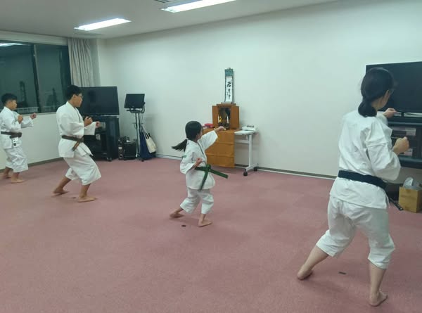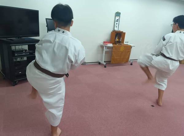 本日は作務、鎮魂行、法話、諸連絡事項、準備運動、基本突き、前進突き、水分補給短時間休憩、技法の修練と続く進行です。
