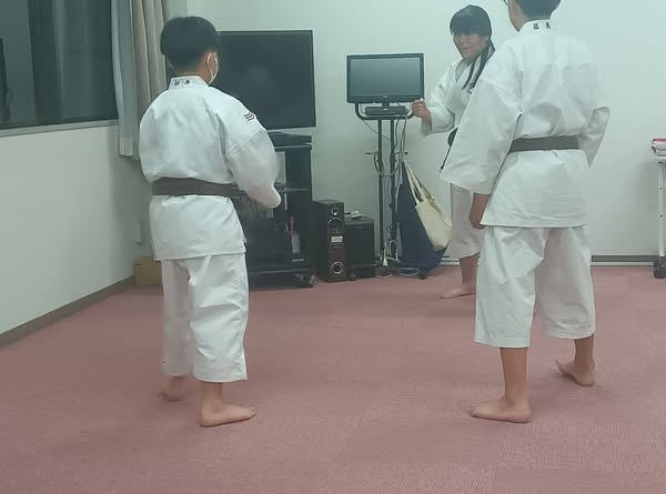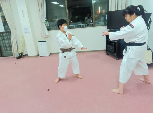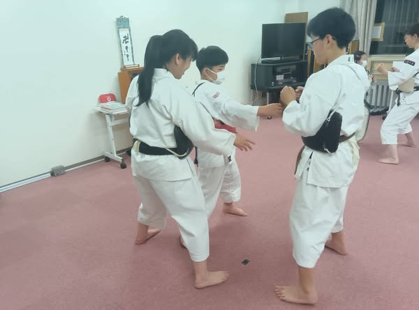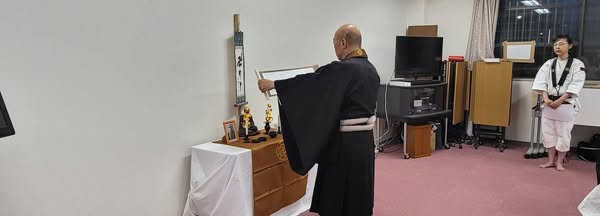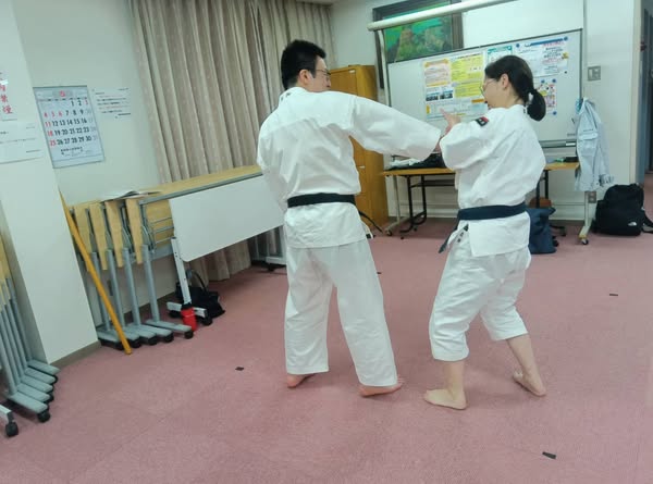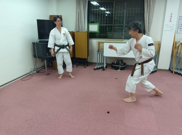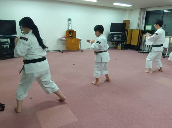 本日は作務、鎮魂行、法話、諸連絡事項、基本突き、前進突き、水分補給短時間休憩を挟み技法の修練に続く進行です。