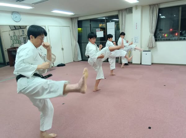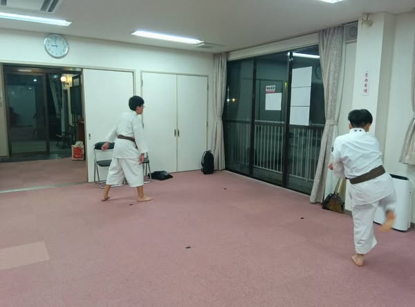 本日は作務、鎮魂行、法話、諸連絡事項、準備運動、基本突き、前進突き、水分補給短時間休憩、技法の修練に続く通常の進行です。