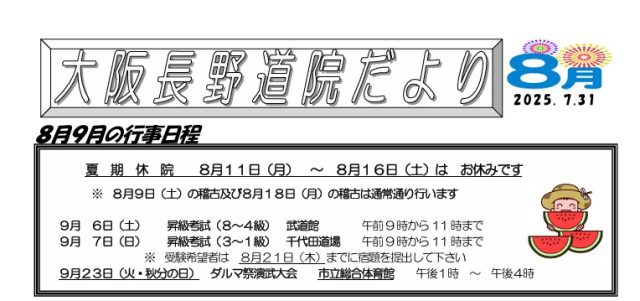 | 2025.12.06 大阪山之上道院 2月の修練日のご案内 2月の修練日をお知らせします。7日(土)、14日(土)、21日(土)、28日(土)は予定どおりです。少年部18:30~20:30一般19:30~21:30専有道... | |